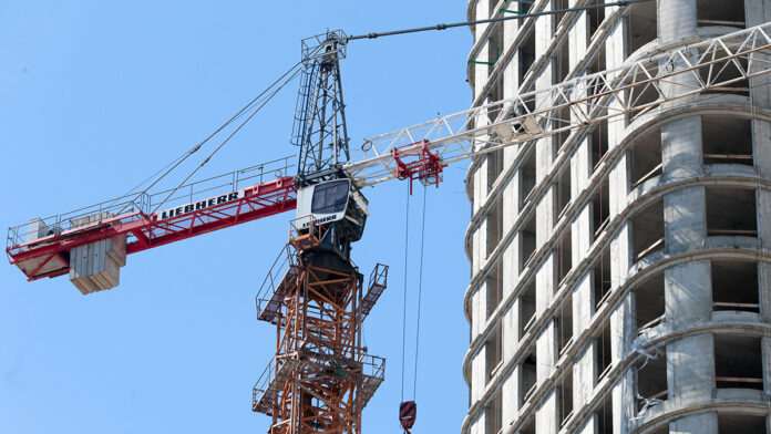 Подъемный кран. Строительство многофункционального жилого комплекса с подземной автостоянкой на ул. Автозаводская.
