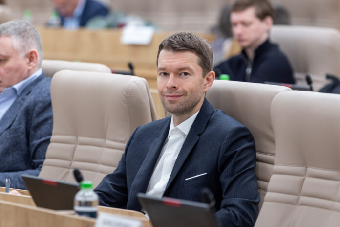 Алексей Вихарев в деловом костюме на собрании в гордуме
