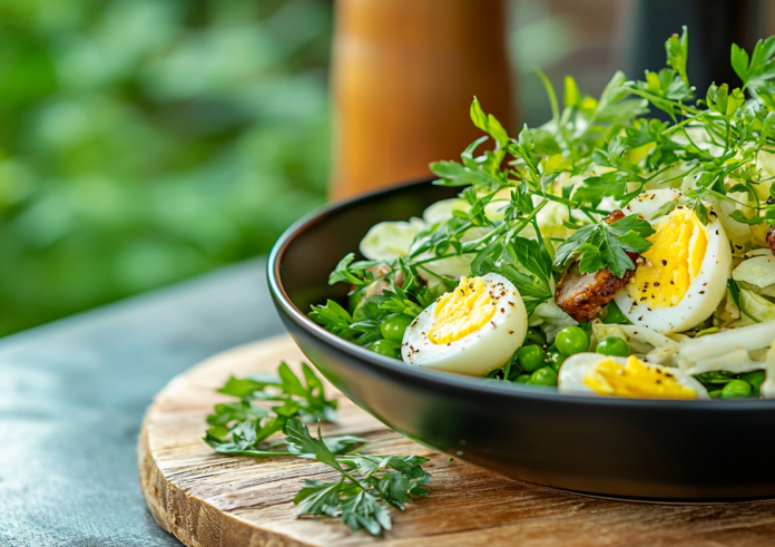 2. В миске соедините все ингредиенты, включая горошек без маринада. Посыпьте перцем.