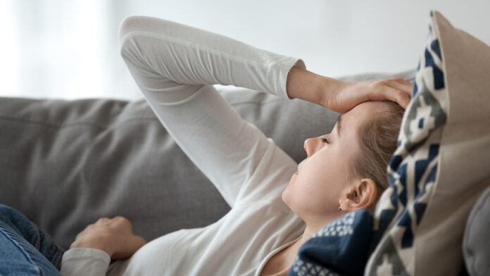 Upset depressed young woman lying on couch feeling strong headache migraine, sad tired drowsy teenager exhausted girl resting trying to sleep after nervous tension and stress, somnolence concept