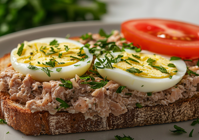 3. Соберите композицию: на хрустящую основу выложите нежную начинку, украсьте ломтиками помидора и веточками укропа.