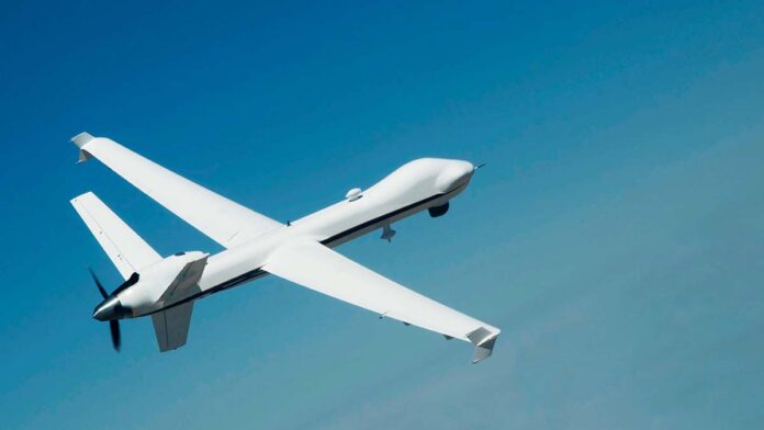 Unmanned aerial vehicle against the sky. Elements of this image furnished by NASA. High quality photo