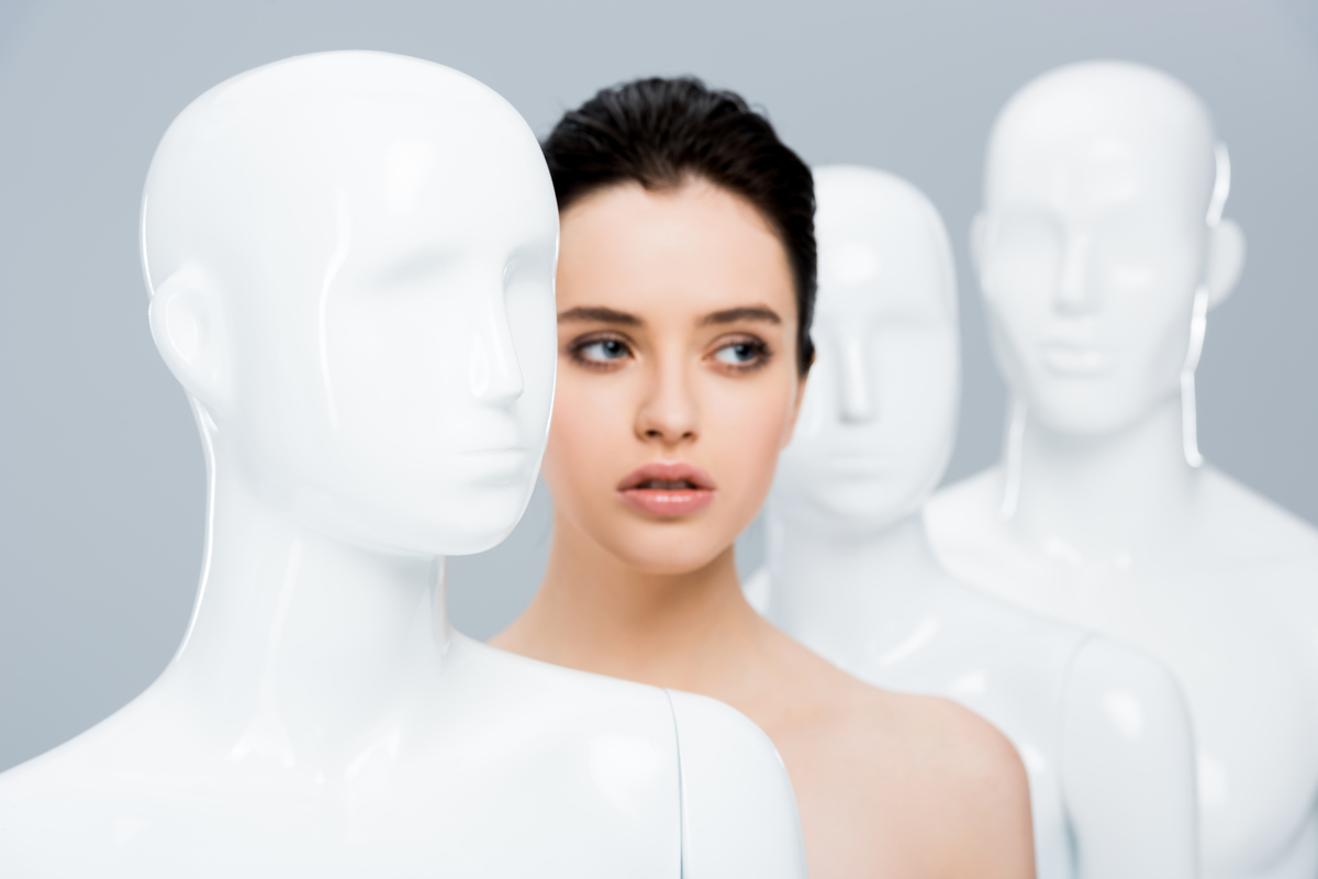 девушка стоит в ряду манекенов