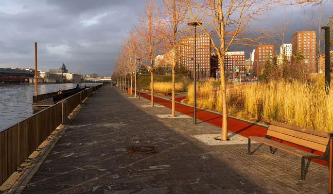 Зону украсили широкие прогулочные аллеи с удобными скамьями, стильными зонами отдыха и лестницей для спуска к воде. Для активных горожан создали беговые маршруты, площадки для воркаута с современными тренажерами, а для детей — яркие игровые комплексы. Особое внимание уделили озеленению: высадили 700 деревьев и кустарников, разбили цветущие клумбы и уложили 8,3 тыс. м² изумрудного газона.