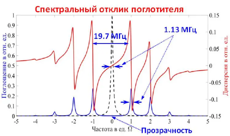 На иллюстрации: показаны спектральные контуры поглощения (синяя кривая) и дисперсии (красная кривая) для резонансного поглотителя Fe-57, совершающего гармонические колебания с частотой 9,85 МГц и амплитудой 0,33 Å. Черная пунктирная кривая демонстрирует спектр фотона до взаимодействия с поглотителем. Иллюстрация предоставлена авторами исследования, Институт прикладной физики РАН.