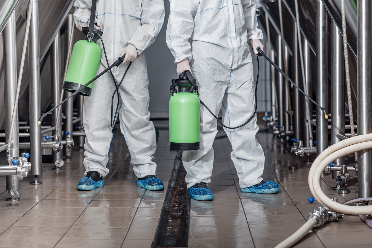 Cleaning of craft beer production. Guys in hazmat suits and masks disinfect equipment, cropped, free space