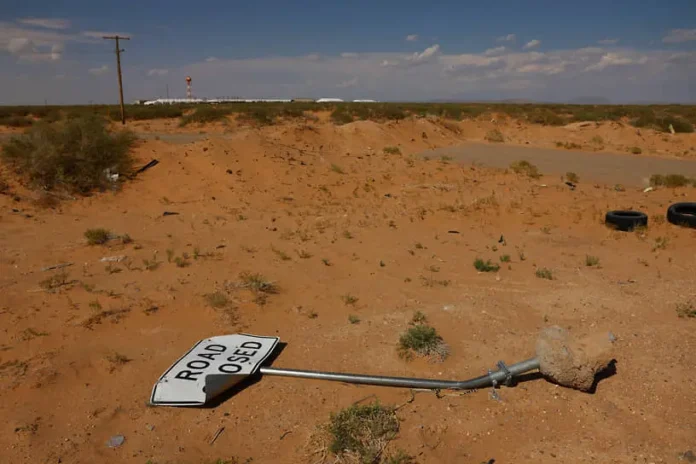 Знак «Дорога закрыта» возле строящегося в Техасе центра содержания нелегальных мигрантов