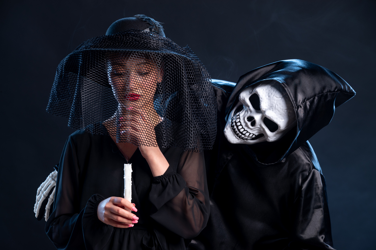young female dressed in black and holding candle on dark desk death grim reaper funeral