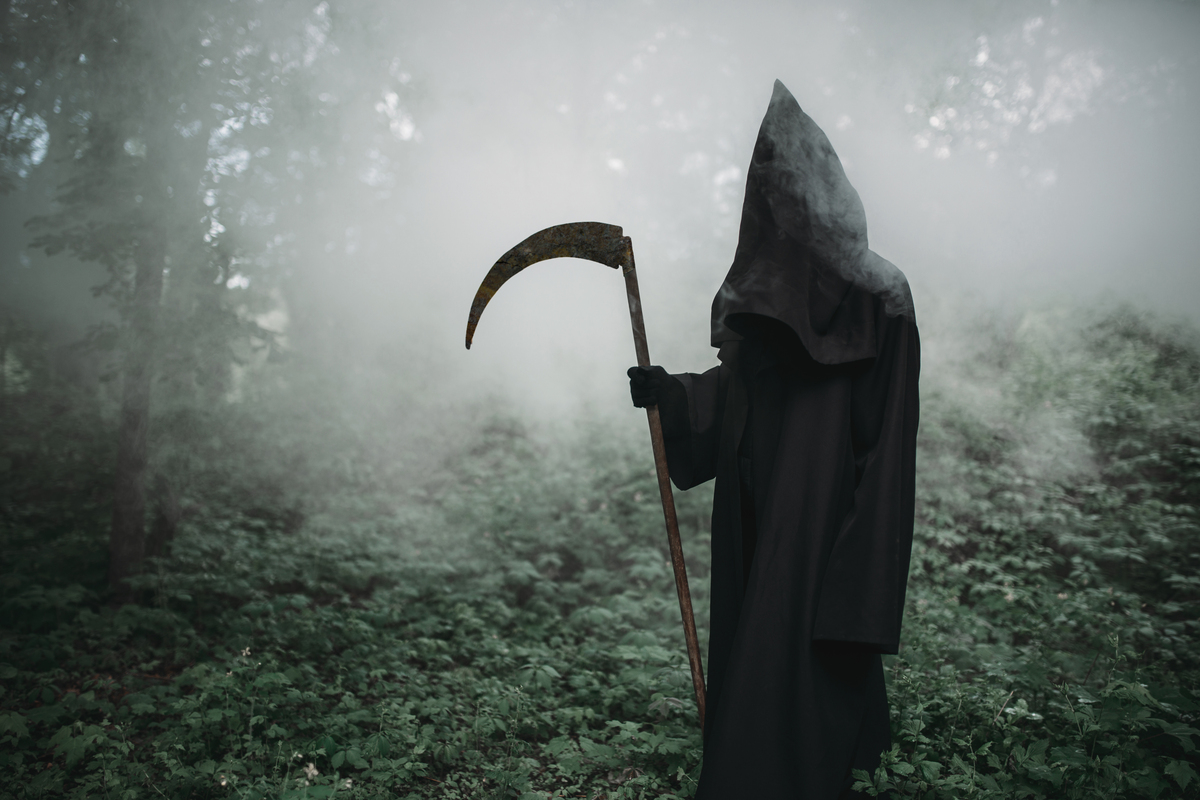 Смерть с косой в темном туманном лесу