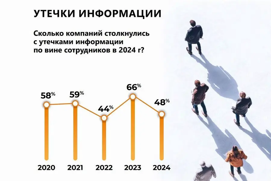 Ежегодный мониторинг показал заметное улучшение ситуации: если в 2023 году с попытками утечек столкнулись 66% организаций, то в 2024 году этот показатель снизился до 48%. Наблюдается устойчивая тенденция к уменьшению инцидентов.