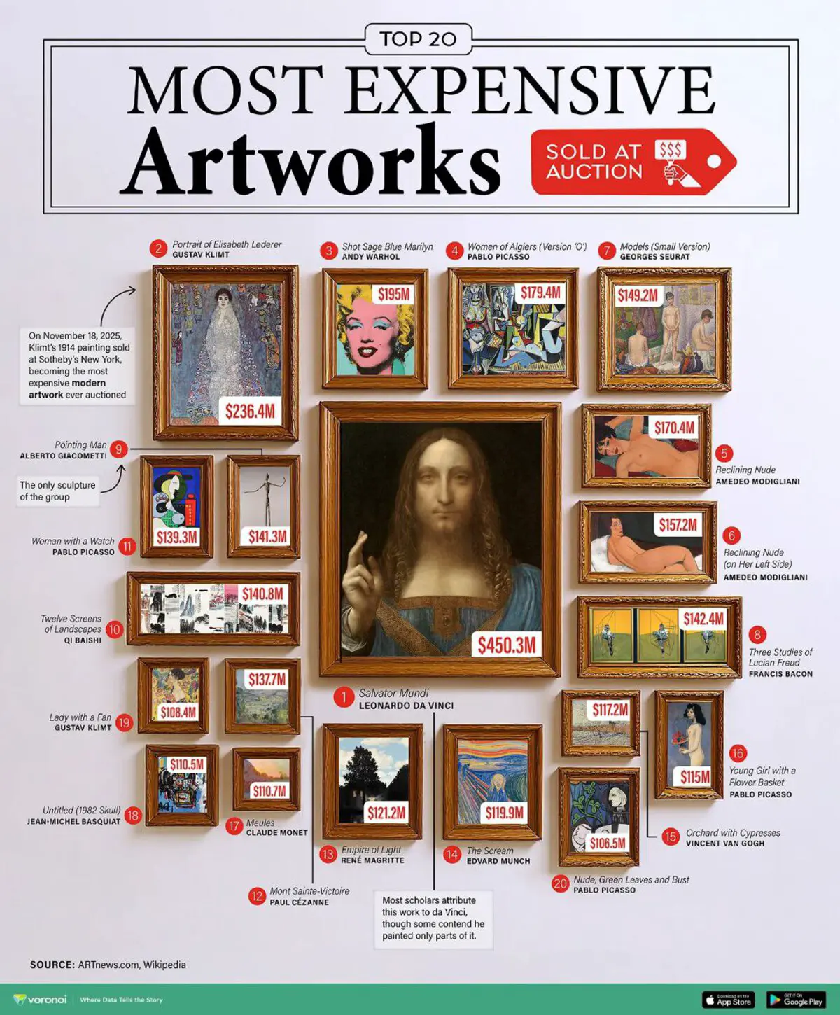 Мир искусства по-прежнему способен поражать воображение астрономическими суммами, которые коллекционеры готовы платить за уникальные произведения. Рейтинг двадцати самых ценных работ, реализованных на аукционах, наглядно демонстрирует, как шедевры Леонардо да Винчи, Густава Климта, Пабло Пикассо, Энди Уорхола, Клода Моне, Жана-Мишеля Баскии и Альберто Джакометти продолжают вдохновлять и привлекать инвесторов со всего мира.
