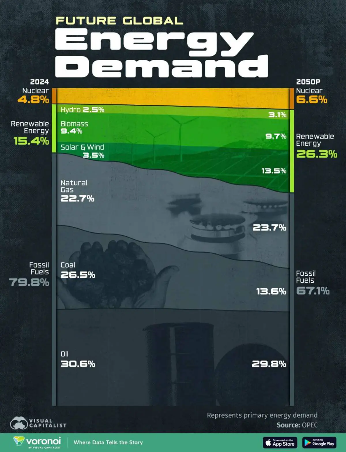 Согласно аналитической инфографике, построенной на прогнозах экспертов ОПЕК, будущий ландшафт энергопотребления будет весьма динамичным. Лидерство сегодня удерживает нефть: её текущая доля составляет 30,6%, и несмотря на прогнозируемое лёгкое снижение до 29,8% к 2050 году, она останется главным мировым энергоресурсом.