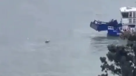 Ролик начинается с береговой линии, где в водном пространстве заметна темная точка рядом с катером. Далее два небольших судна направляются к берегу. На борту одного из них виден черный пакет с телом.