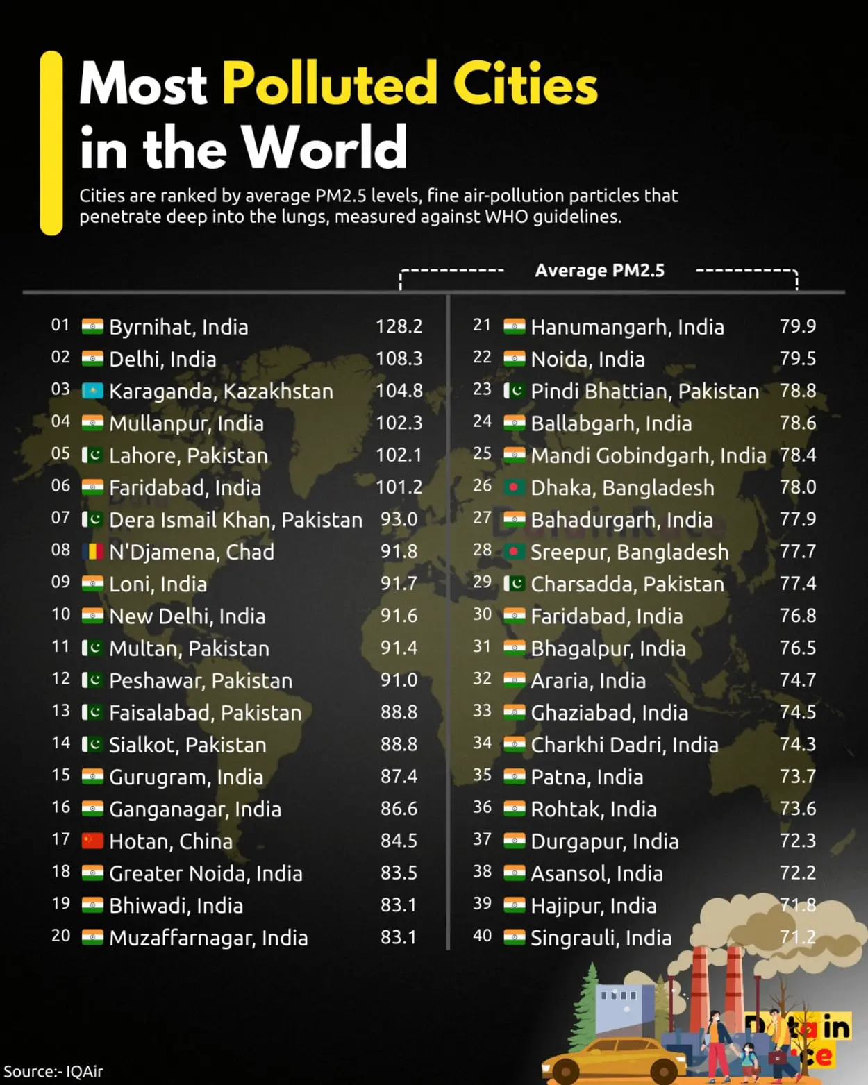 Традиционно города Южной и Юго-Восточной Азии занимают первую строчку в мировом списке по уровню загрязнённости воздуха. Особенно заметна сложная ситуация в Индии, где города Бирнихат и Дели в 2024 году возглавили рейтинг тех, кто сталкивается с самой высокой концентрацией PM2.5. В Бирнихате среднее годовое содержание этих частиц составило 128,2 мкг/м³, в столичном Дели — 108,3 мкг/м³.