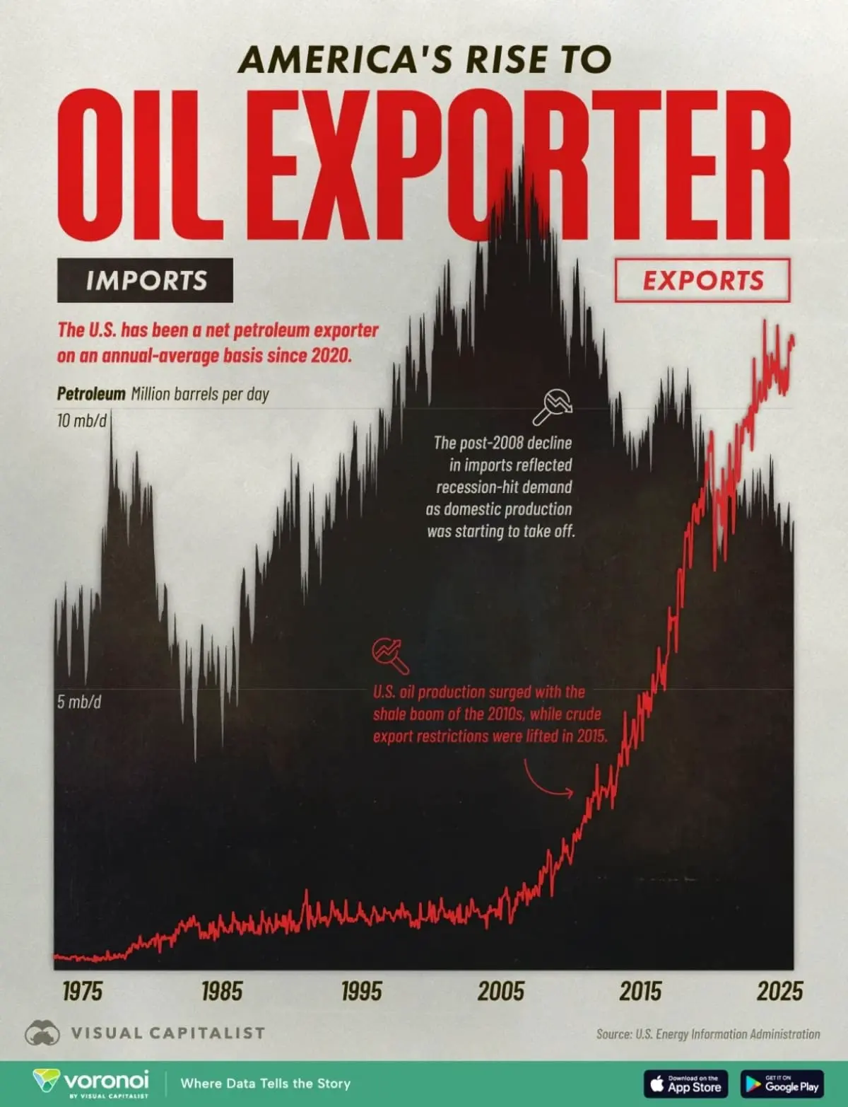 Инфографика иллюстрирует динамику нефтяного импорта и экспорта США с 1973 года на основе информации Управления энергетической информации (EIA). Она ярко демонстрирует путь страны от сильной внешней зависимости к позиции экспортера.